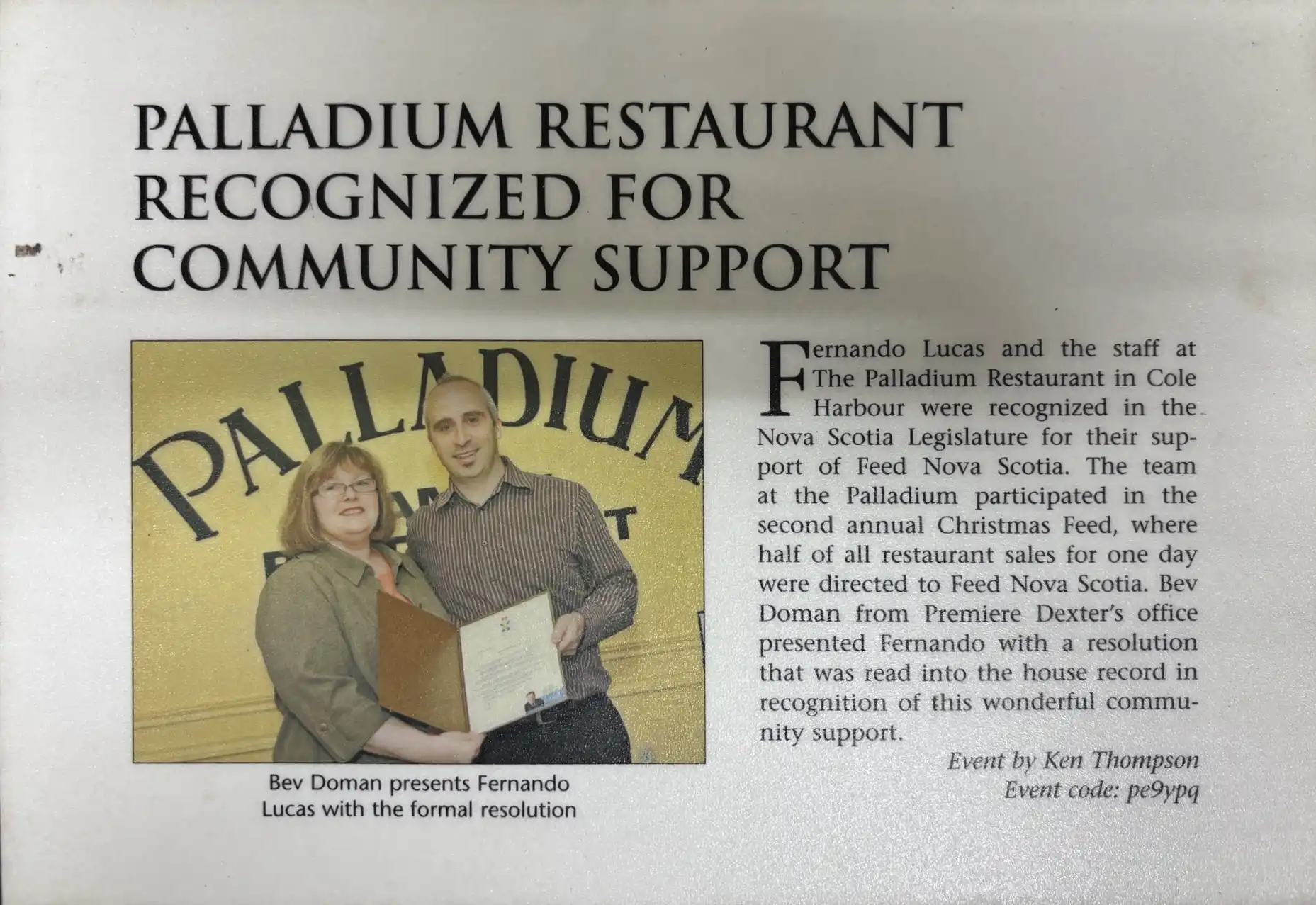 Fernando Lucas and the staff at The Palladium Restaurant in Cole Harbour were recognized in the Nova Scotia Legislature for their support of Feed Nova Scotia. The team at the Palladium participated in the second annual Christmas Dinner, where half of all restaurant sales for one day were directed to Feed Nova Scotia.